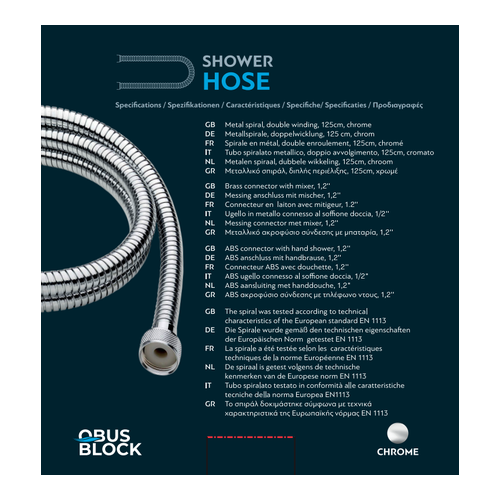 The double-wound metal shower hose 125 cm long offers durability and ease of use, with the guarantee of German manufacturing. The double winding makes it more resistant to wear and distortion, ensuring a longer lifespan. It has a metal nozzle for connection to a 1/2” battery and an ABS nozzle for connection to a 1/2” shower head, offering reliable application and tightness. It has been tested according to the technical specifications of the European Standard EN1113, ensuring high quality and reliability.
