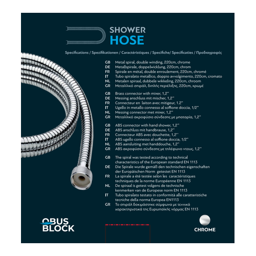 The double-wound metal shower hose 220 cm long offers excellent durability and flexibility, with the guarantee of German manufacturing. It has a metal 1/2” battery connection nozzle and an ABS nozzle for connecting to the 1/2” shower head, ensuring a stable fit and tightness. Thanks to the double winding, it is particularly resistant to wear and distortion. The product has been tested according to the technical specifications of the European Standard EN1113, offering top quality and long-term reliability.