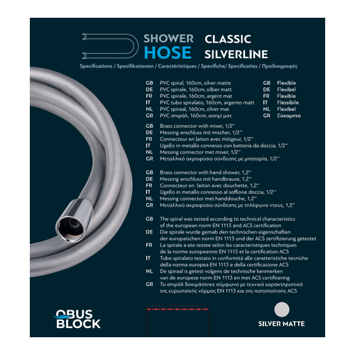 The 200 cm PVC shower spiral combines flexibility and durability, with the guarantee of German manufacturing. Its flexible design offers comfort in everyday use, while the metal connection nozzles (1/2”) with the battery and shower head ensure a stable fit and tightness. It has been tested according to the technical specifications of the European Standard EN1113 and has ACS certification, which confirms its high quality and reliability.