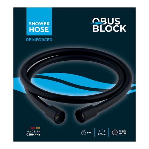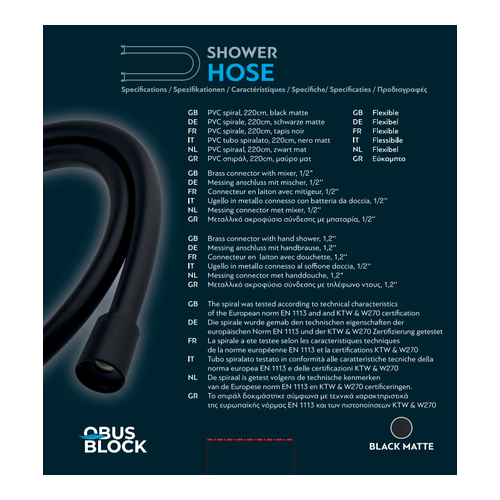 The PVC shower spiral 220 cm in elegant matte black combines flexibility and reliability, with the guarantee of German manufacturing. It is flexible for comfort in everyday use and features an ABS 1/2” battery connection nozzle as well as an ABS nozzle for connection to the 1/2” shower head, ensuring easy and stable application. It has been tested according to the technical specifications of the European Norm EN1113, as well as the KTW & W270 certificates, offering durability and long-term reliability.