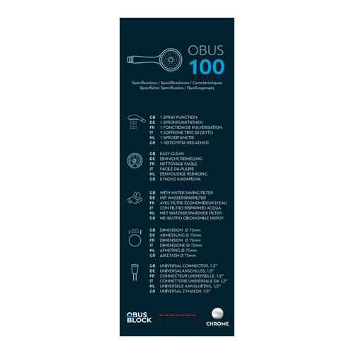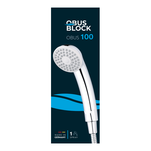 The Obus 100 shower handset offers a simple and enjoyable bathing experience, with the guarantee of German manufacturing. It features 1 spray function for comfortable daily use, a water-saving filter to reduce consumption without loss of performance and an easy-to-clean system for removing limescale. With a diameter of Ø75 mm and a universal 1/2” connection, it fits any standard shower installation, combining quality and practicality.