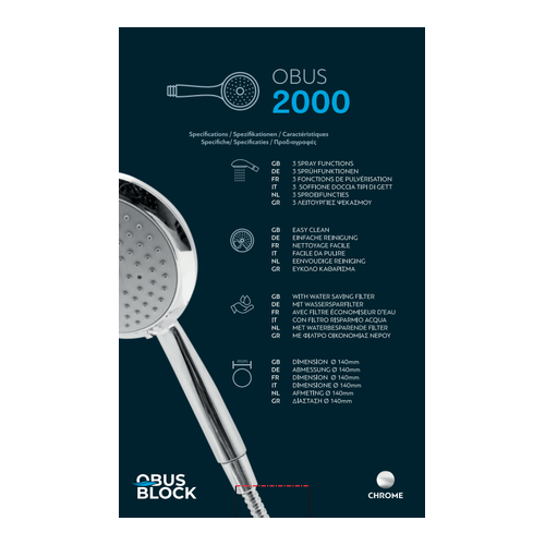 The Obus 2000 shower handset offers high performance and elegant aesthetics, with the guarantee of German manufacturing. It has 3 spray modes for a personalized experience, a water-saving filter to reduce consumption without losing performance and an easy-cleaning system for removing limescale. With a diameter of Ø140 mm, it ensures a rich and uniform water flow, upgrading your daily comfort.