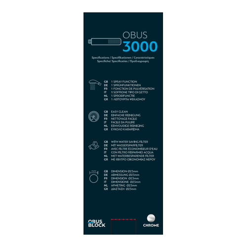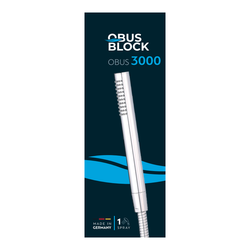 The shower handset Obus 3000 combines minimal design and practicality, with the guarantee of German manufacturing. It features 1 spray function for simple and comfortable daily use, a water-saving filter for lower consumption without loss of performance and an easy-to-clean system for removing limescale. With a diameter of Ø23 mm, it is ideal for compact solutions and special shower applications.