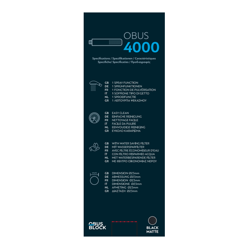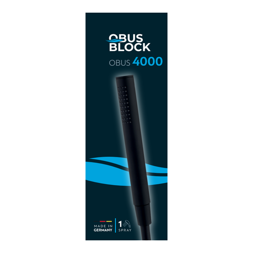 The shower handset Obus 4000 offers a minimal look and functionality, with the guarantee of German manufacturing. It features 1 spray function for simple and comfortable use, a water-saving filter to reduce consumption without loss of performance and an easy-cleaning system for easy removal of limescale. With a diameter of Ø23 mm and an elegant matte black finish, it is an ideal choice for compact and modern shower solutions.
