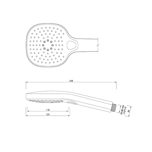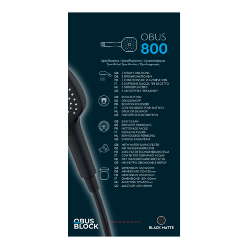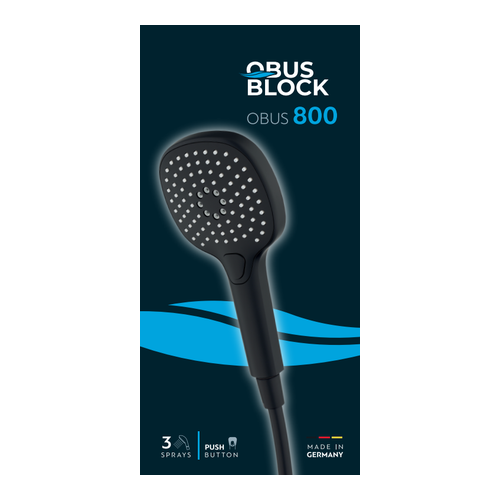 The shower handset Obus 800 combines modern design and advanced functionality, with the guarantee of German manufacturing. It has 3 spray modes for a personalized shower experience and a Push Button function for instant switching between them with one touch. It incorporates a water-saving filter for reduced consumption without loss of performance, as well as an easy-to-clean system for removing limescale. With dimensions of 120×120 mm and an elegant matte black finish, it offers a rich and uniform water flow, upgrading the aesthetics of your bathroom.