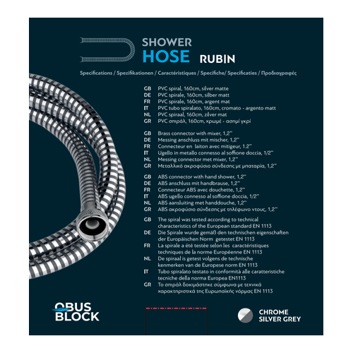 The PVC shower spiral 160 cm offers durability and reliability, with the guarantee of German manufacturing. It has a metal nozzle for connection with a 1/2” battery and an ABS nozzle for connection with a 1/2” shower head, ensuring a perfect fit and tightness. Manufactured with high quality standards, it has been tested according to the technical specifications of the European Standard EN1113, offering wear resistance and a long service life.